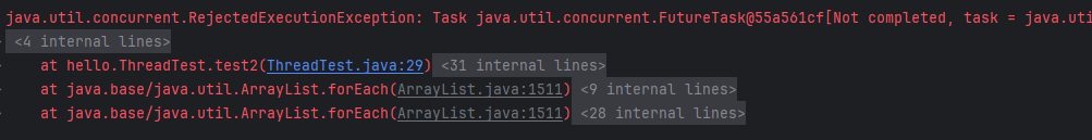 결과는 아래와 같이 최대 쓰레드 풀 크기만큼 쓰레드가 생성되고 RejectedExecutionException 에러가 발생합니다.
